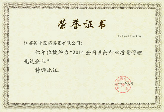 江苏吴中医药集团荣获“2014年全国医药行业质量管理先进企业”