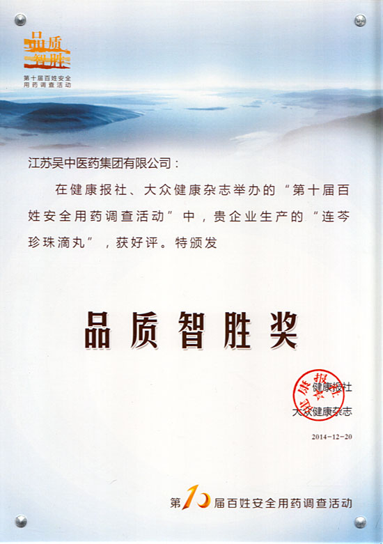 本届“百姓安全用药”调查活动,主题定为“品质智胜 守护生命”,通过《健康报》、健康报网、搜狐网健康频道、39健康网等媒体公开发布调查问卷,内容围绕百姓对安全用药知识掌握程度、百姓用药需求等方面展开。通过公众自主投票,江苏吴中医药集团“连芩珍珠滴丸”荣获“品质智胜奖”。