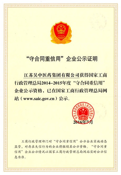 江苏吴中医药集团有限公司获得国家级“守合同重信用”企业公示资格