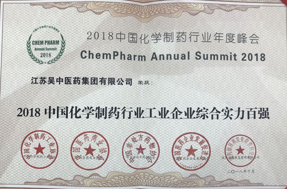 2018 年10月16日,由中国化学制药工业协会、中国医药商业协会、中国非处方药物协会、中国医药企业发展促进会、国药励展展览有限责任公司共同主办的“2018中国化学制药行业年度峰会”在南京举办。 峰会上,江苏吴中医药集团有限公司获得“2018中国化学制药行业工业企业综合排名百强”的殊荣。江苏吴中医药集团将继续努力,齐心协力,共同推动制药行业品牌建设,保障人民群众用药安全有效。