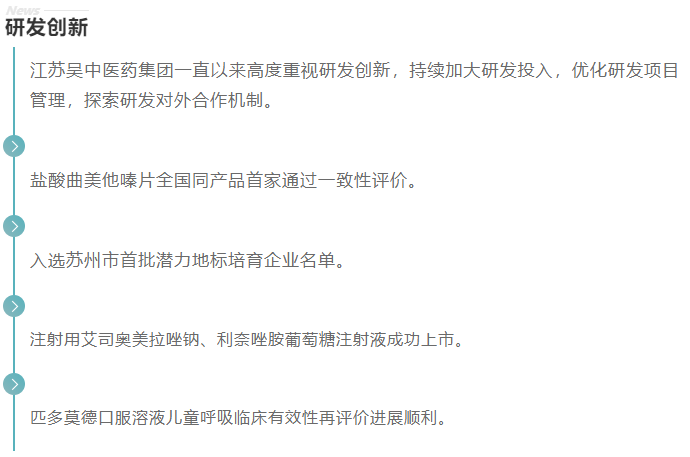 根据苏州市《市政府关于公布第三批苏州市自主品牌大企业和领军企业先进技术研究院建设企业名单的通知》,江苏吴中医药集团有限公司入选苏州市第三批自主品牌大企业和领军企业先进技术研究院建设企业名单。