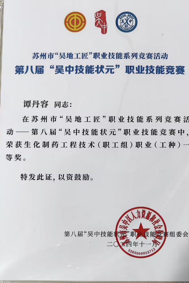 由苏州市吴中区人民政府、苏州市人力资源和社会保障局、苏州市总工会联合主办的第八届“吴中技能状元”职业技能竞赛顺序落下帷幕,医药集团苏州制药厂共50名选手参加比赛,理论和实操双通过50人,双通过率为100%。