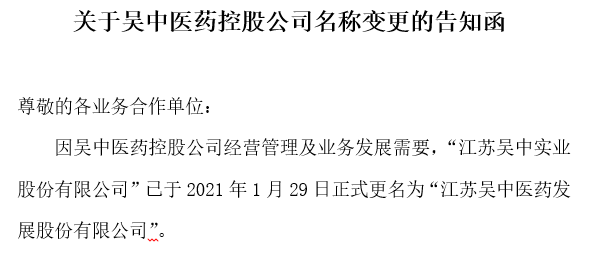 尊敬的各业务合作单位:因吴中医药控股公司经营管理及业务发展需要,“江苏吴中实业股份有限公司”已于2021年1月29日正式更名为“江苏吴中医药发展股份有限公司”。感谢各业务合作单位长期以来对公司的关注与支持,因股份公司更名给您带来的不变,我们深表歉意。特此告知!