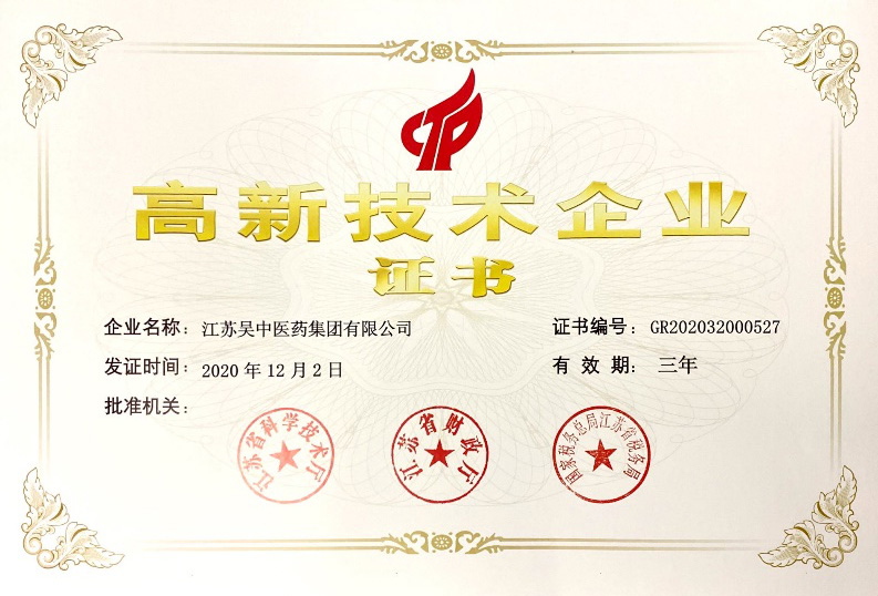 根据苏州市高新技术企业申报管理工作协调小组《转发江苏省2020年度第一批高新技术企业的通知》(苏科高〔2021〕6号),江苏吴中医药集团有限公司获评江苏省高新技术企业,吴中医药自2008年来持续获评该项荣誉。