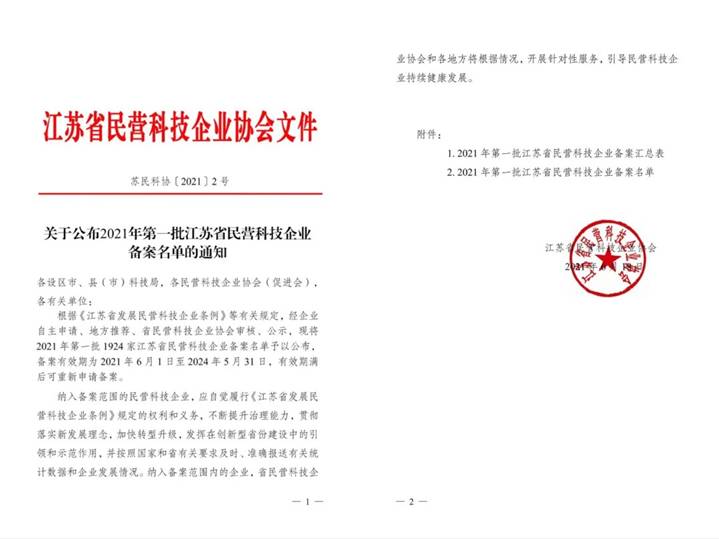 根据《关于公布2021年第一批江苏省民营科技企业备案名单的通知》(苏民科协〔2021〕2号),江苏吴中医药集团有限公司入选2021年第一批江苏省民营科技企业备案名单,吴中医药自2016年起连续入选江苏省民营科技企业。