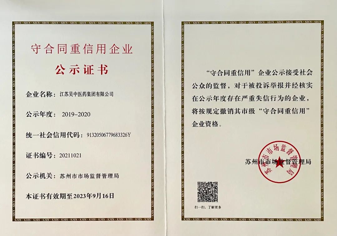 近日,吴中医药再度获评苏州市“守合同重信用”企业,公司连续多年获评,是公司守法经营、深入推动诚信建设、坚持诚信履约的重要体现,也是社会各界对企业长期诚信经营的肯定,市场监管部门对企业的高度认可...