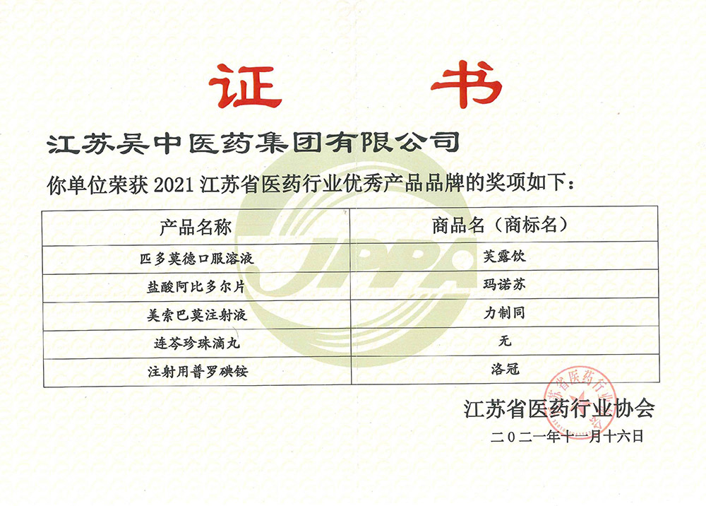 吴中医药五项产品荣获江苏省医药行业优秀产品品牌