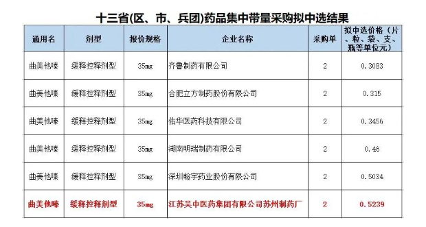 吴中医药盐酸曲美他嗪缓释片拟中标十三省药品集采