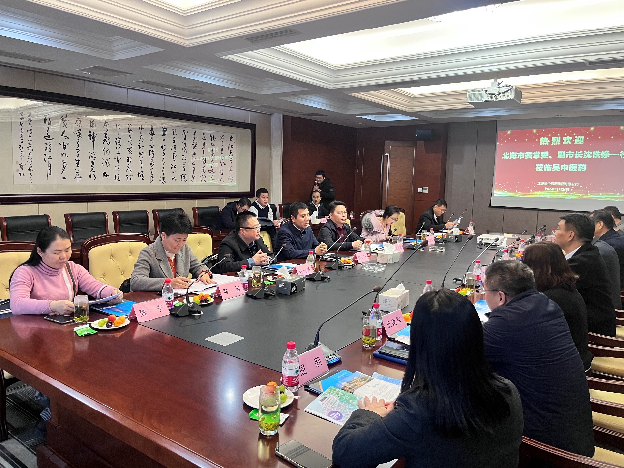 1月26日,广西北海市市委常委、副市长沈铁铮率金融办、工信局、投资促进局等一行部委办局分管负责人到访江苏吴中医药集团有限公司,江苏吴中副总裁、吴中医药董事长兼总经理孙田江、江苏吴中财务总监孙曦、总工程师吴振邦、经营管理部总监王建军表示了热烈欢迎...