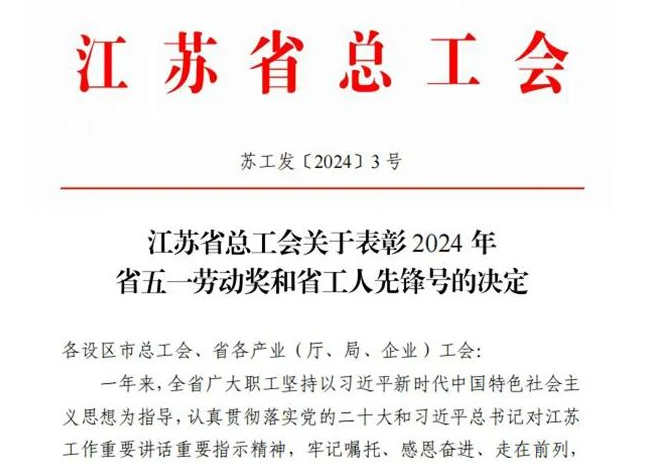4月23日,根据《江苏省总工会关于表彰 2024年省五一劳动奖和省工人先锋号的决定》(苏工发〔2024〕3号),江苏吴中医药发展股份有限公司获评江苏省五一劳动奖状...