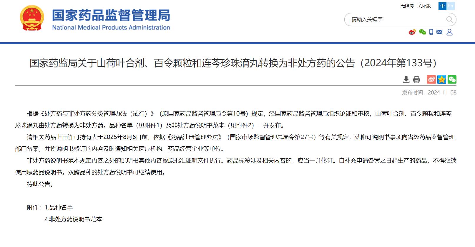 11月8日,国家药品监督管理总局发布2024年第133号公告,根据《处方药与非处方药分类管理办法(试行)》(原国家药品监督管理局令第10号)规定,经国家药品监督管理局组织论证和审核,公司下属江苏吴中医药集团有限公司苏州制药厂生产的连芩珍珠滴丸由处方药转换为非处方药...