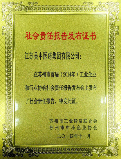 12月9日,在苏州首届(2014年)工业企业和行业协会社会责任报告会上,江苏吴中医药集团有限公司发布社会责任报告。
