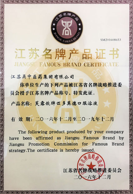 “芙露饮”匹多莫德口服溶液获得江苏名牌产品