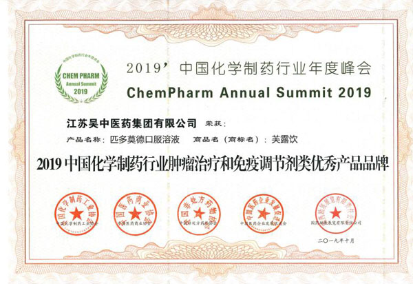 吴中医药产品芙露饮荣获“2019中国化学制药行业肿瘤治疗和免疫调节剂类优秀产品品牌”称号。