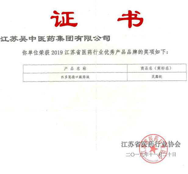11月25日,江苏省医药行业协会三届二次理事(扩大)会暨江苏医药产业发展年度峰会上,颁布了2019江苏省医药行业优秀产品品牌,吴中医药独家产品芙露饮牌匹多莫德口服溶液荣获2019江苏省医药行业优秀产品品牌。