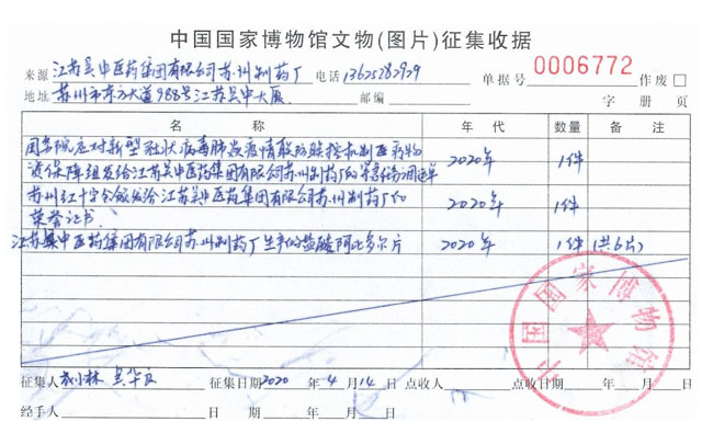 2020年4月17日,江苏吴中医药集团收到中国国家博物馆文物(图片)征集收据,国务院应对新冠疫情联防联控机制(医疗物资保障组)向该企业发出的紧急任务调运单、苏州市红十字会颁发的捐赠证书以及吴中医药生产的特效“抑制药”阿比多尔片三件物品被征集,未来将作为文物进行展出,公司抗疫贡献再次被认可。