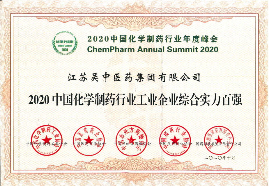 凭借过硬的产品质量、诚信为本的经营管理与持续推进的品牌建设,江苏吴中医药集团有限公司荣获“2020中国化学制药行业工业企业综合实力百强”。