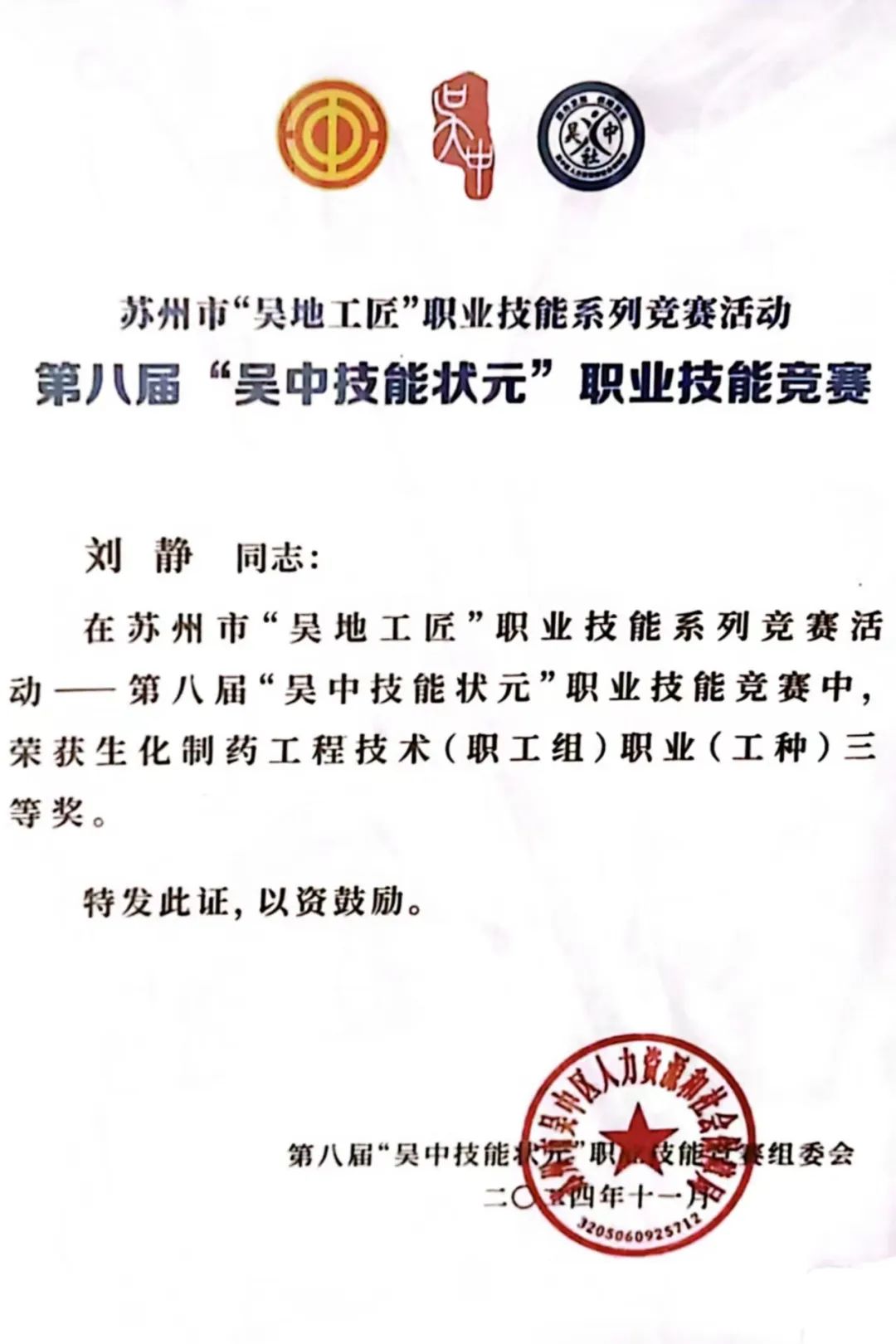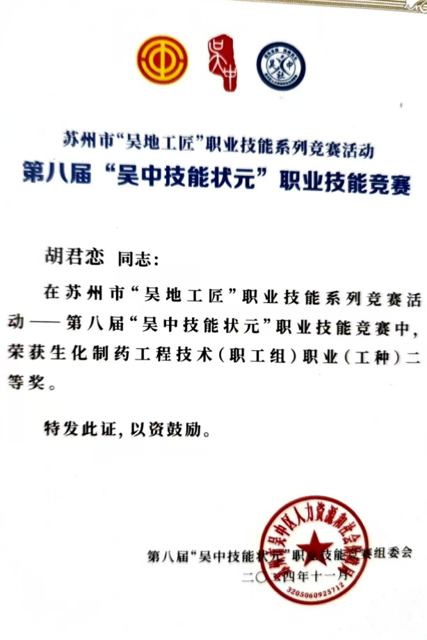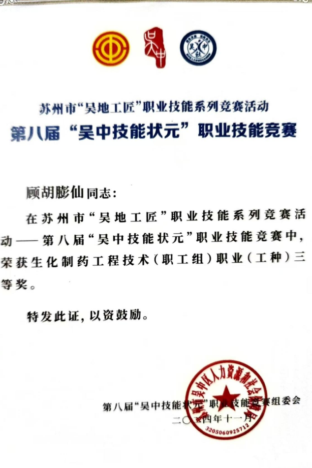 由苏州市吴中区人民政府、苏州市人力资源和社会保障局、苏州市总工会联合主办的第八届“吴中技能状元”职业技能竞赛顺序落下帷幕,医药集团苏州制药厂共50名选手参加比赛,理论和实操双通过50人,双通过率为100%。 公司参赛选手赛前认真准备、赛中严格遵守规则、赛后积极复盘总结,在本次竞赛中取得了优异成绩。其中,苏州制药厂质量保障部QC的6位员工在生化制药工程技术(职工组)职业(工种)系列比赛中硕果累累,谭丹容荣获一等奖,胡君恋和踪利华荣获二等奖,朱亚楠、顾胡膨仙和刘静荣获三等奖。